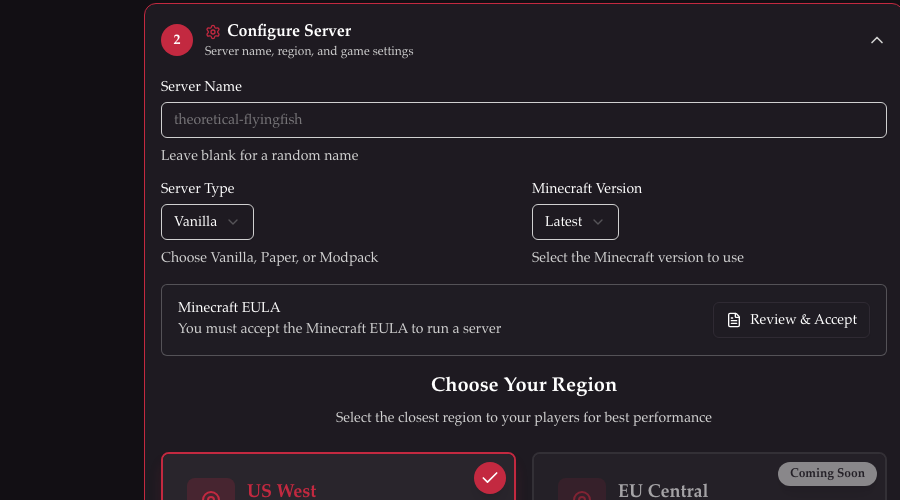 Set your server name, game-specific options, and choose a region.