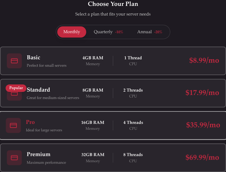 The Standard plan is the most popular choice — it offers a great balance of performance and price for most games.
